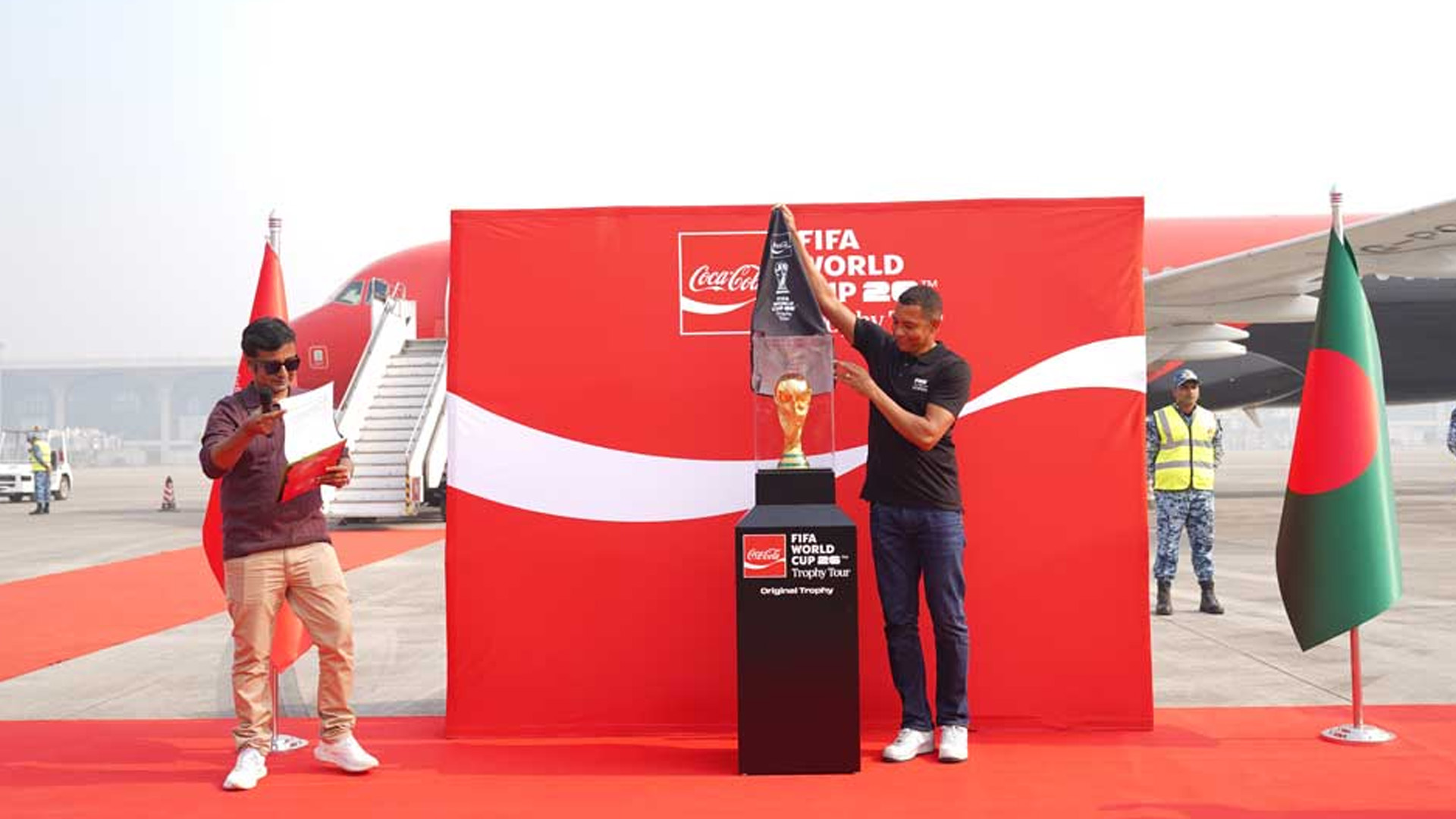 কোকা-কোলার উদ্যোগে বুধবার (১৪ জানুয়ারি) সকালে ঢাকায় এসে পৌঁছায় ২০২ ফিফা বিশ্বকাপের ট্রফি। ফিফার দূত হিসেবে ট্রফির সঙ্গে এসেছেন ব্রাজিলের হয়ে বিশ্বকাপ, কোপা আমেরিকা ও কনফেডারেশন কাপ জয়ী গিলবার্তো সিলভা।